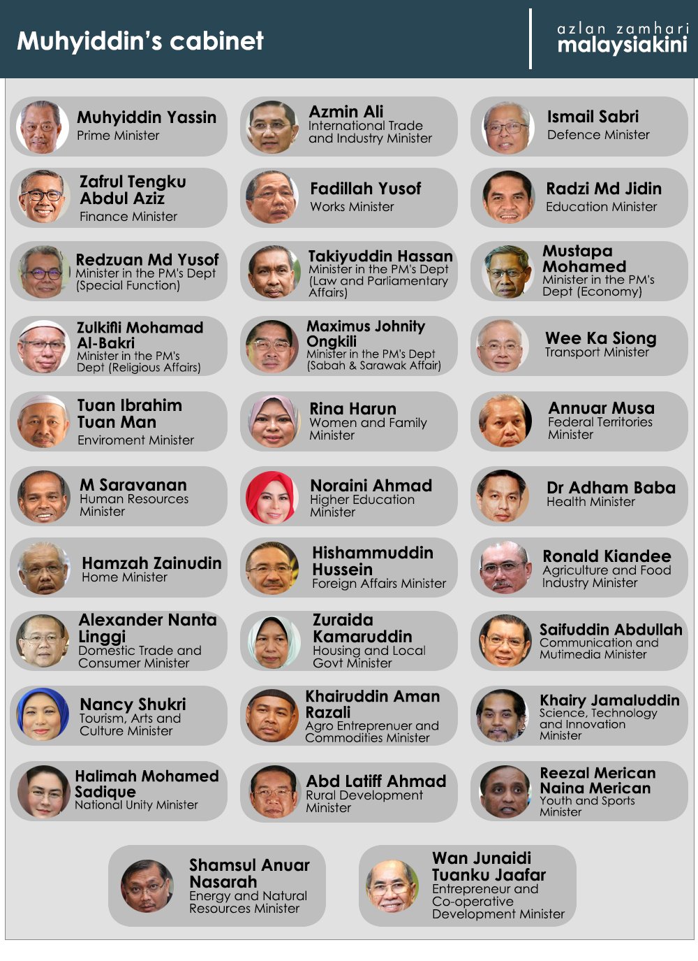It was also reported that the prime minister had submitted the list of names to the Yang di-Pertua Agong at Istana Negara at about 5pm today. After one week of being appointed as the 8th Prime Minister of Malaysia Tan Sri Muhyiddin Yassin has announced the names of Cabinet members at the Prime Ministers Office. MyInfo Minister of State Chief Minister.